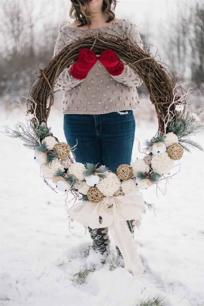 With its neutral colours and natural elements, this rustic wreath with pom poms also transitions seamlessly into a versatile piece for general winter decor.