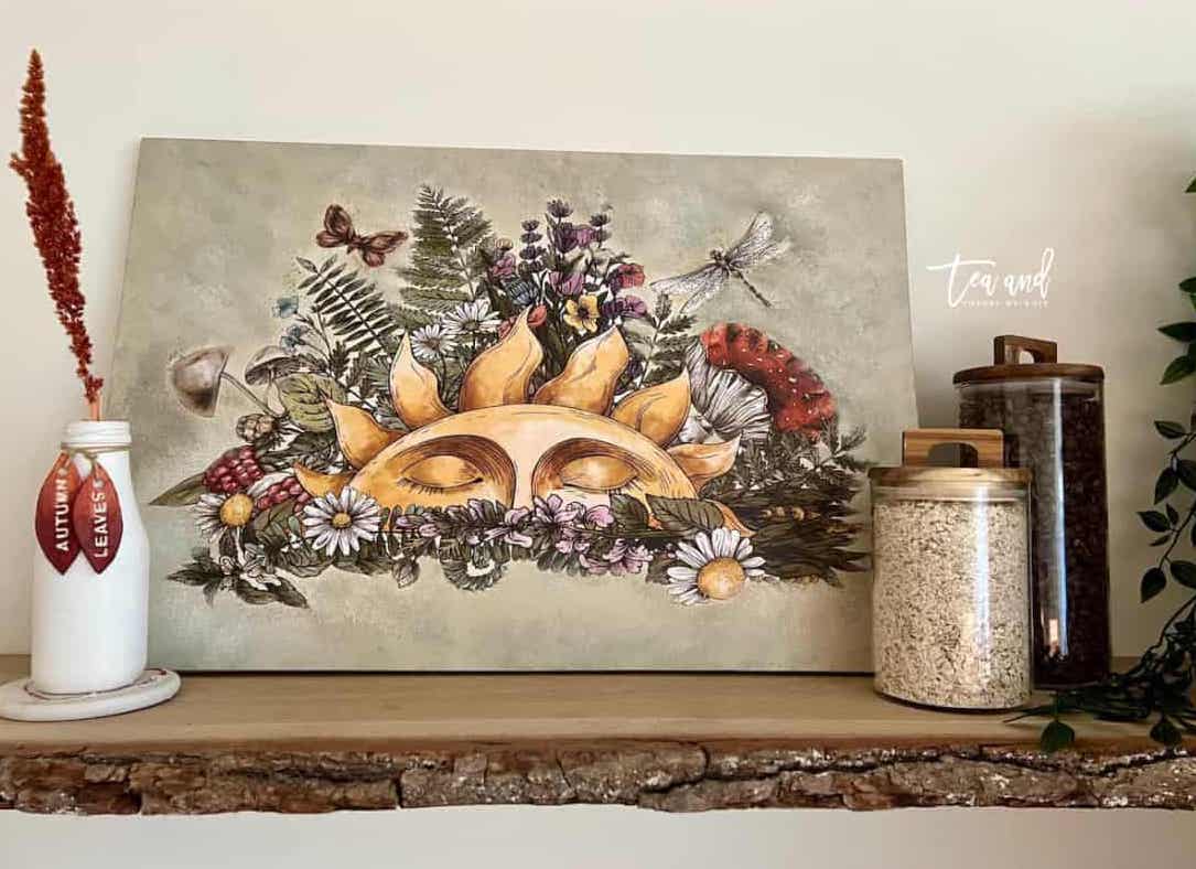 This Here Comes The Sun decoupage paper is so beautiful. Mixed with the greige background, it is the perfect autumnal wall art.